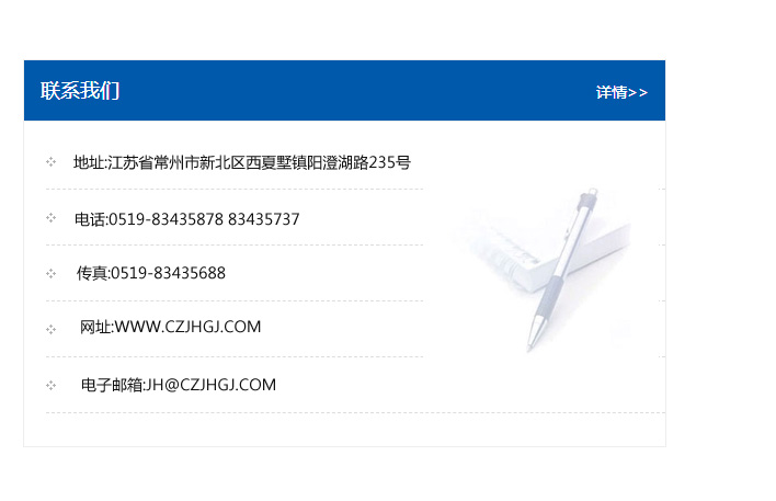 傳真:0519-83435688    郵編:213135    網址:WWW.czjhgj_com.sparklegz.com    電子郵箱:JH@czjhgj_com.sparklegz.com